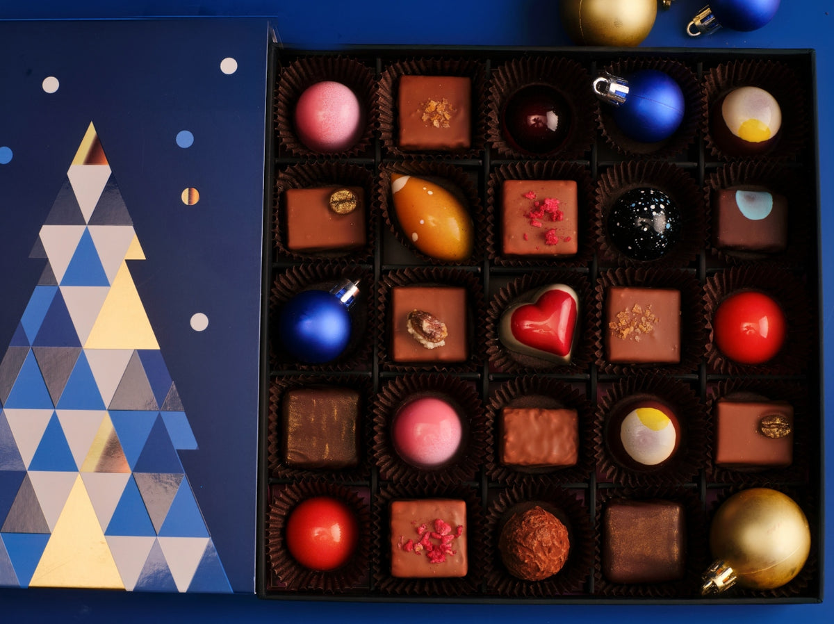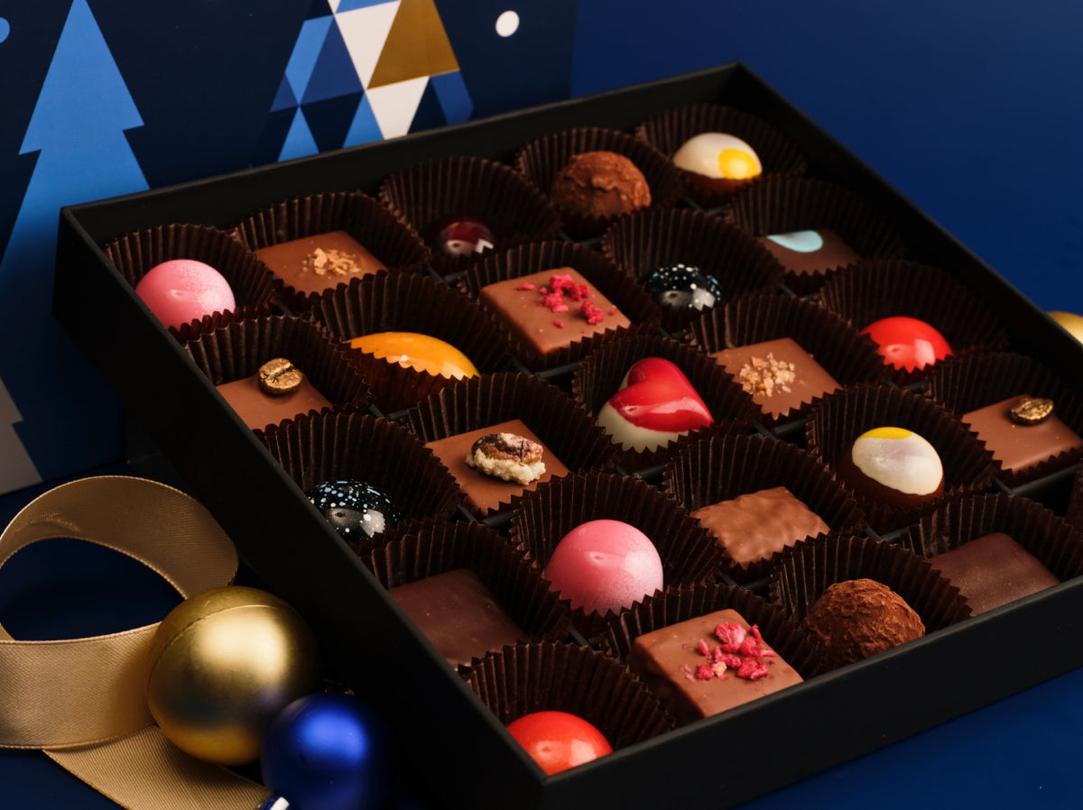 Celebrate Christmas with our 25-piece signature chocolate box, wrapped in a custom-designed festive sleeve adorned with gold foiling.