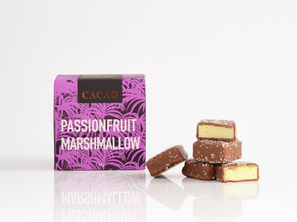 Passionfruit Marshmallow (view further information) - This product contains Milk & Soya. May contain traces of Treenuts, Peanuts, Egg, Gluten, Almond